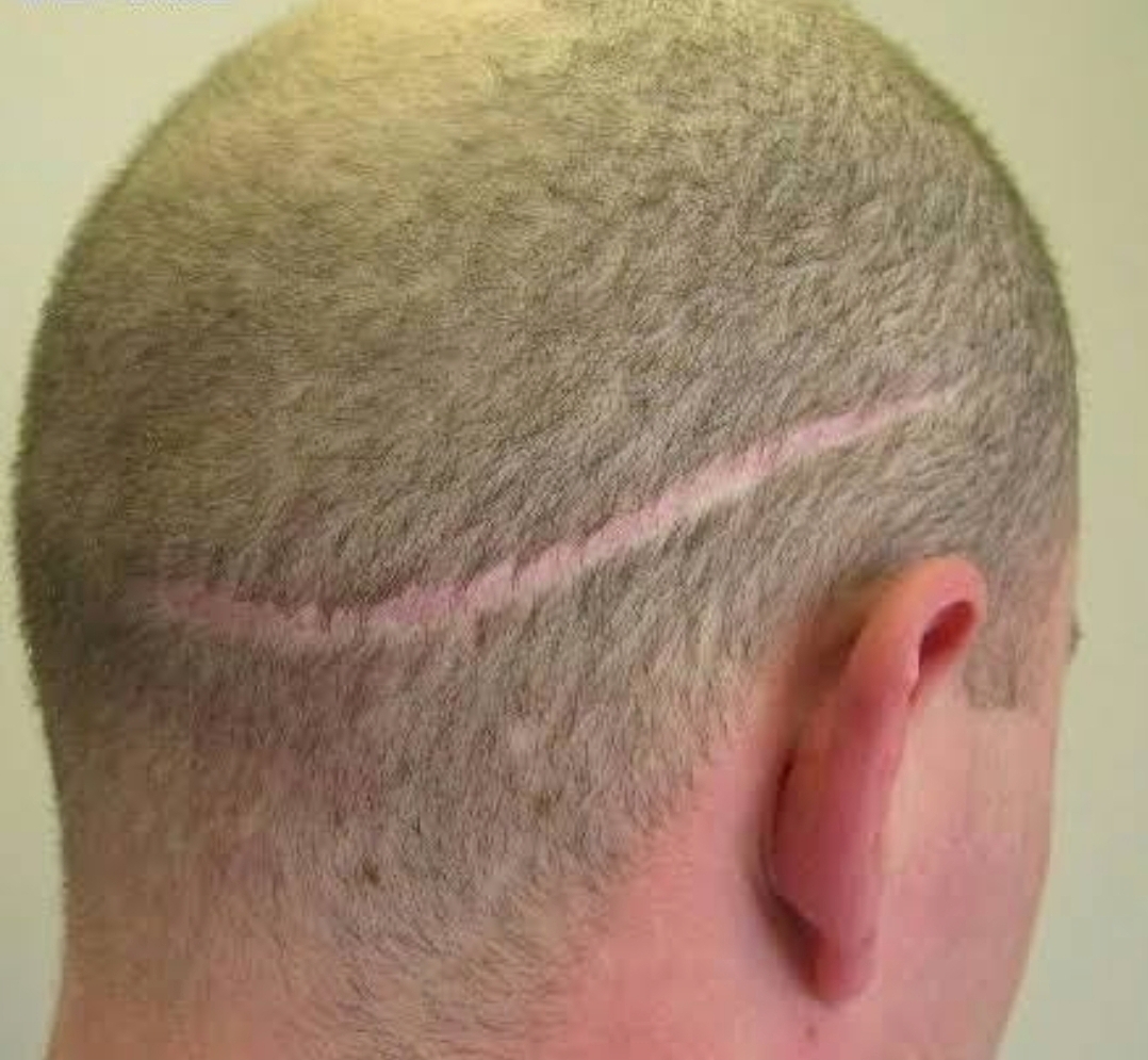 • Linear Scar – A visible scar remains on the back of the head.